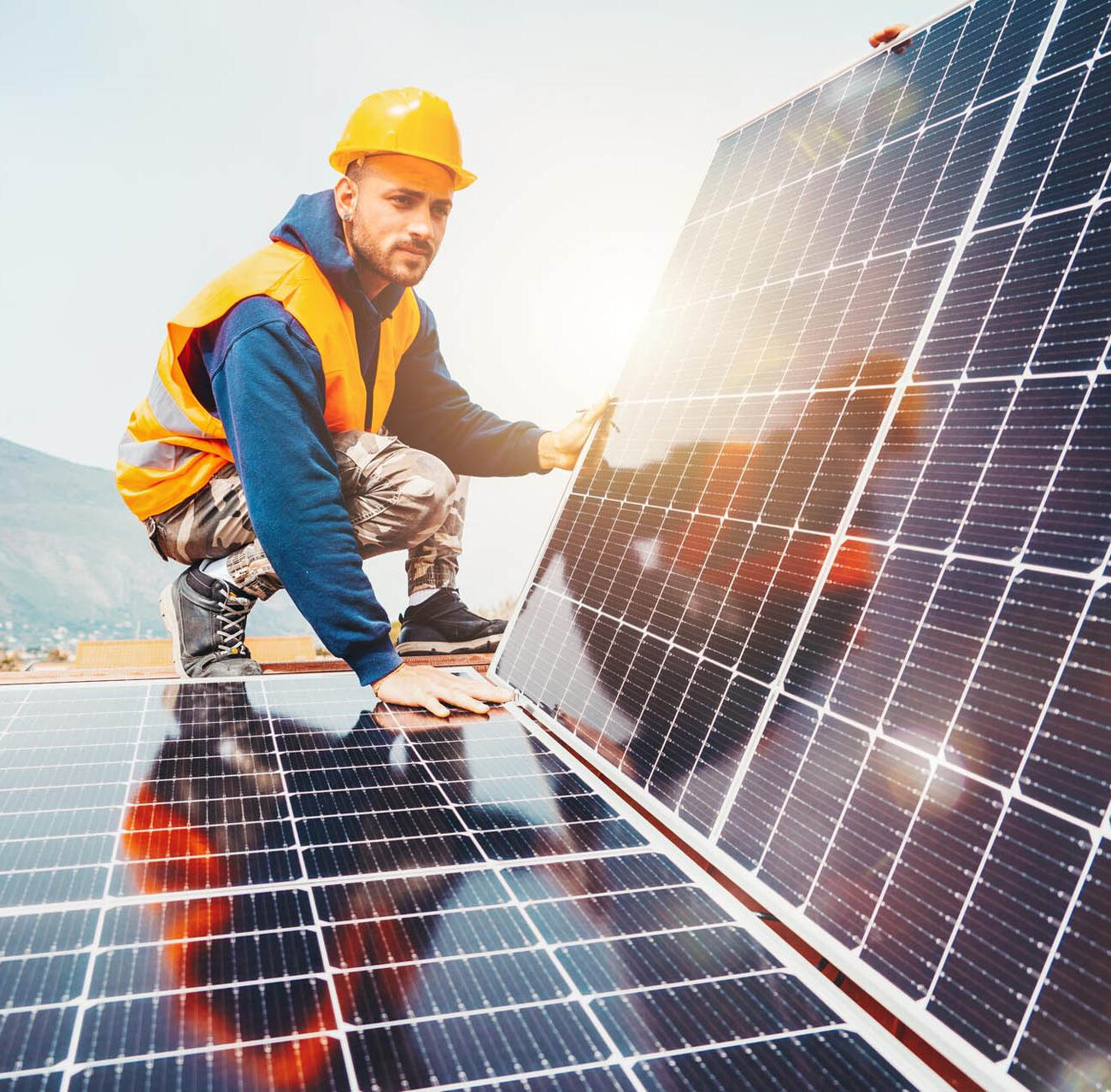Setting up solar panels and related equipment at residential, commercial, or industrial locations.